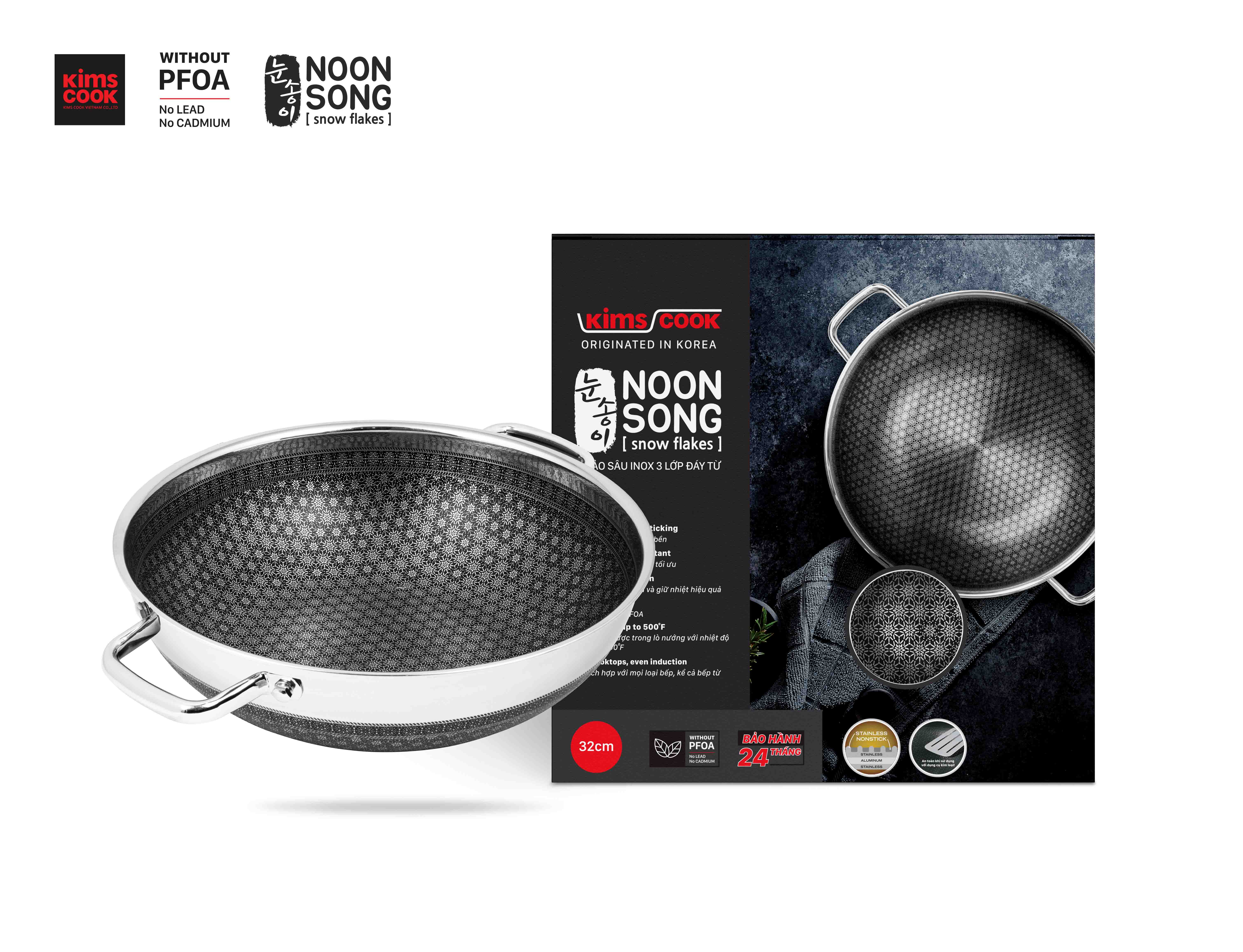 Chảo đáy từ KIMS COOK Noon Song là khoan khắc bề mặt inox để làm trồi lên những trụ nhỏ xếp hình hoa tuyết, trụ inox trồi cao che chắn và bảo vệ những tác động từ các dụng cụ nấu ăn lên lớp không dính. Lớp không dính của hãng Hàn Quốc không chứa PFOA tốt cho sức khoẻ.
