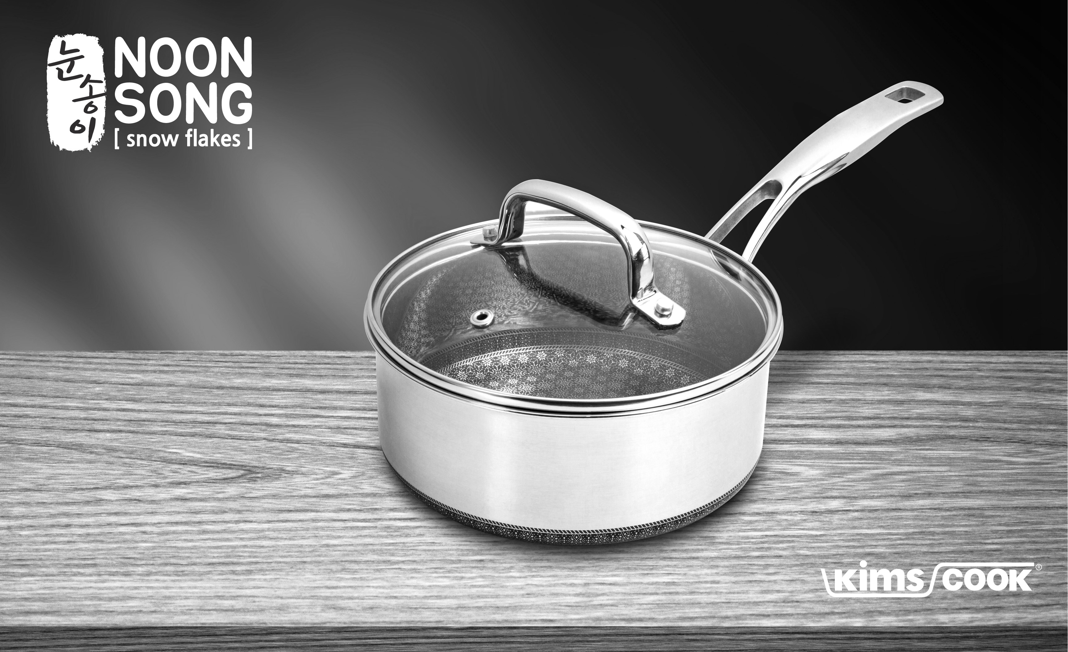 Quánh đáy từ KIMS COOK Noon Song là khoan khắc bề mặt inox để làm trồi lên những trụ nhỏ xếp hình hoa tuyết, trụ inox trồi cao che chắn và bảo vệ những tác động từ các dụng cụ nấu ăn lên lớp không dính. Lớp không dính của hãng Hàn Quốc không chứa PFOA tốt cho sức khoẻ.